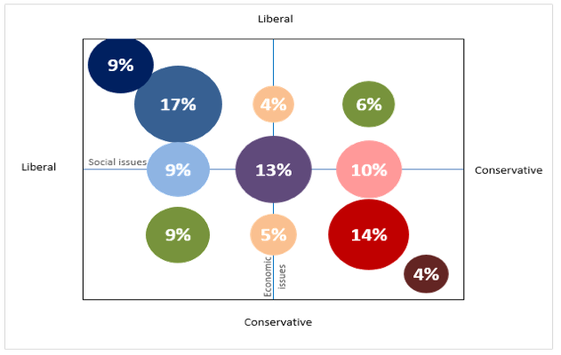 As we found in our past research, there are a few centers of ideology that emerge across the political spectrum. About a quarter of Americans are firmly on the liberal end of the ideological spectrum and about 1 in 5 are solidly on the conservative end. This leaves a little over half of would be voters living somewhere in between the two ends of the political spectrum. The last two elections have both increased and magnified the divide growing over the past decade, and unfortunately, there’s little evidence pointing to this dynamic changing over the next few years.