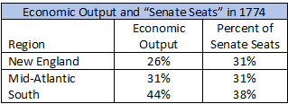 At the time of the Constitutional Convention, the economic output among the 13 colonies was relatively consistent. Looking at the percentage of the real product per capita of the 13 colonies, the region with the highest output was the South, largely due to slave labor.[1] In 1774, New England’s economic output represented 26% of the overall output, and the same area would have held 31% of the seats in the Senate (if the Senate had existed). The Mid-Atlantic region contributed 31% of the economic output with 31% of the seats. The Southern states produced 44% of the economic output with 38% of the seats. The differences between the proportion of economic output of each region of colonies and the proportion of its seats were all within +/- 6%. In contrast, a comparison of these same three regions in 2016 reveals that the differences between the proportion of economic output of each region and the proportion of its Senate seats were as wide as +/- 17%. In 2016, New England’s economic output dropped to only 16%, as the Mid-Atlantic’s rose to 48%, and the South dropped to 36%. Though each region’s portion of economic contribution has changed since 1774, its number of seats in the Senate remains the same.
