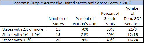 Even more striking is a comparison of economic output versus percentage share of Senate seats throughout the entire United States today. In 2016, 15 states generated 69% of the nation’s total economic output, but these states had just 30% of the Senate seats. The 15 states with an intermediate level of economic contribution (between 1% and 1.9% of total GDP) produced 21% of the overall economic output of the country and had a more proportional level of representation in the Senate (30%). The remaining 20 states with the lowest levels of economic contribution (less than 1% of total GDP) produced just 9% of the country’s overall economic output but controlled an incredible 60% of the seats in the Senate.